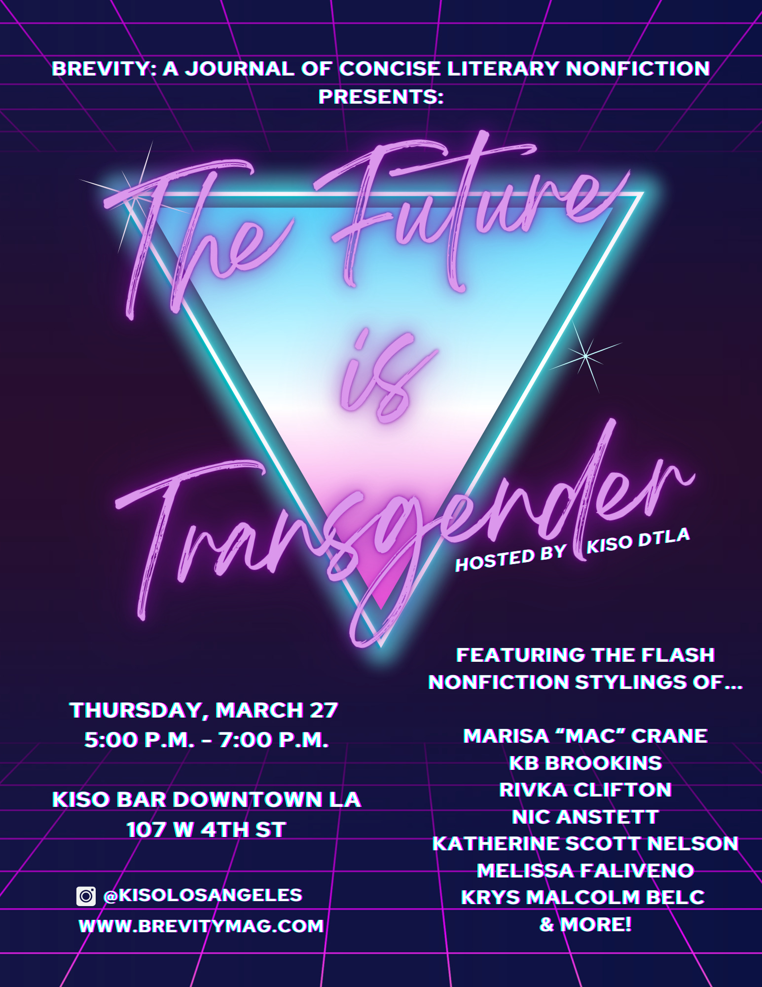 If you’re going to AWP in Los Angeles this year, come say hi. I’m doing an offsite reading with Brevity magazine at KISO, a gay bar and event space in DTLA, on Thursday, March 27th from 5–7pm.